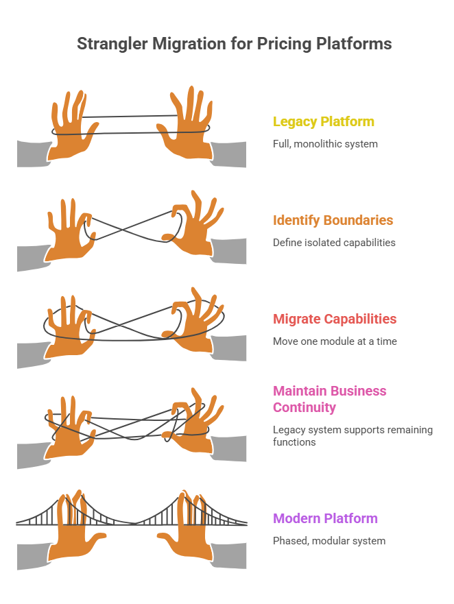 This is commonly known as a strangler-style migration, but for pricing and distribution systems, the important part is not the name. The important part is boundary selection.