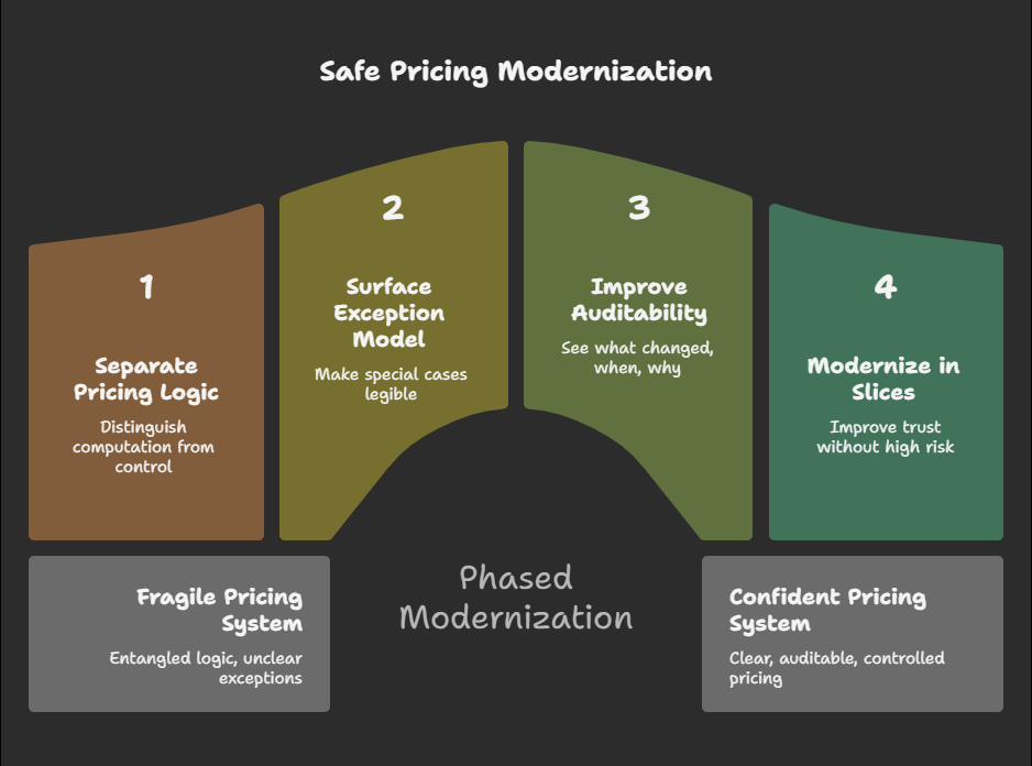 This is also why many pricing modernization efforts go wrong. Teams treat the system like an old application that needs a better interface or a cleaner service layer. What they actually have is a mature control mechanism that has accumulated years of implicit business logic.